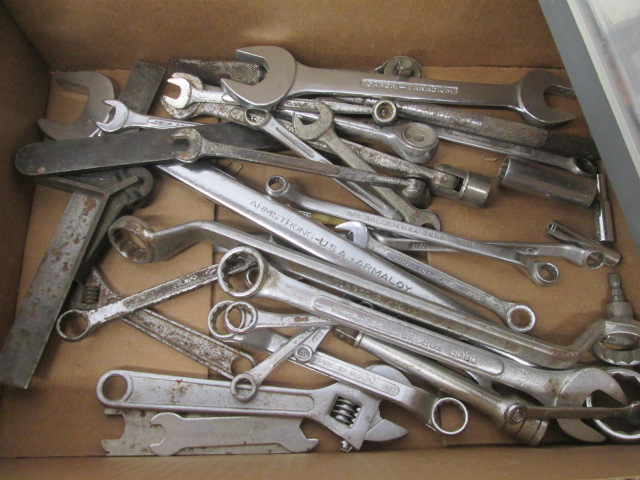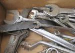 This large box of wrenches are in a variety of sizes and types. They are in used, good condition. Please preview.