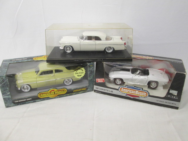 This trio of three collectible model cars includes an impressive ERTL American Muscle 1:18 scale die cast metal 1967 Corvette L-88, a nice American Muscle 1:18 scale 1949 Mercury Coupe die cast car and a 1956 Chrysler 300 in a clear plastic display case. These items are in new and used, good condition. The boxed cars are in new condition. The Chrysler (car) is in good condition however the plastic display case is cracked. Please preview.
