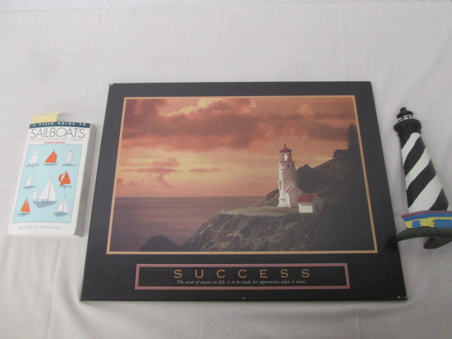 This lovely nautical themed lot features a 20" X 15" photo (on board) of a lighthouse at sunset titled Success, a book titled "Sailboats 2nd Edition", a cast metal lighthouse inspired door stop, and a "Lighthouses of N.J." shot glass. These items are in used, good condition. Please preview.