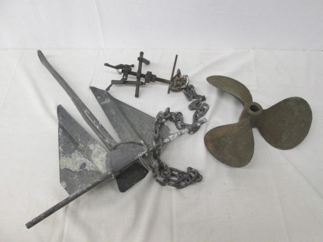 Ahoy! This lot contains a nice Danforth style, fluke boat anchor and a brass propeller. These items are in good condition. Please preview.