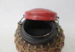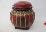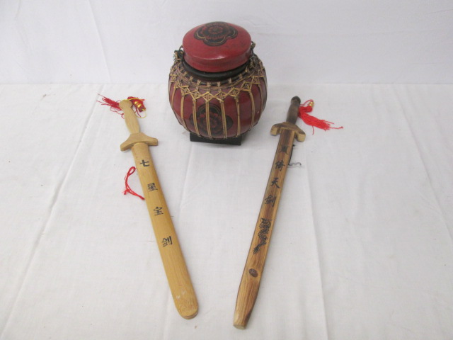 Traditional Thai rice basket and two wooden replicas of oriental swords with sheaths. Please preview.