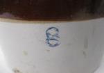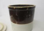 Eight gallon brown and white stoneware crock with lid. The lid has been repaired but it also has a chip missing. Please preview.