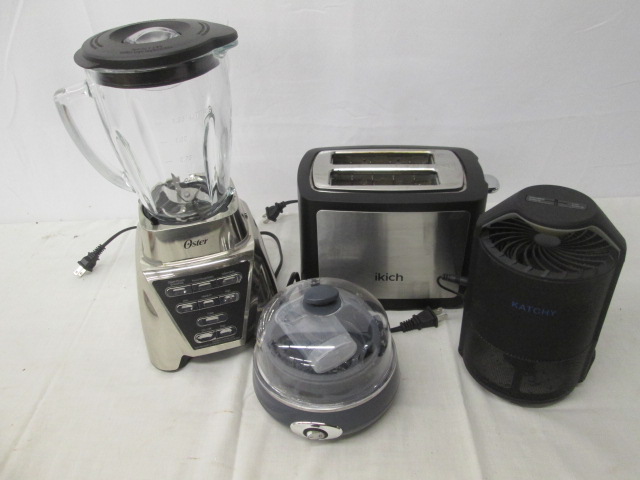 Lot of small appliances including an Oster blender, an ikich toaster, an Elite Gourmet egg cooker, a Safety Can Express can opener and a Katchy mosquito trap. Please preview.