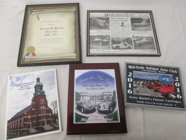 A 2003 Rolls Royce Owners' Club National Award plaque, a 2016 Mid-State Antique Auto Club Silver Sponsor plaque, and a 1971 Greater Fitchburg Chamber of Commerce Achievement Award in picture frame, plus more. Please preview.