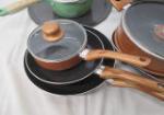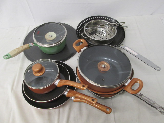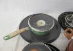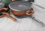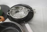 Bin of fry pans, saucepans and lids. Includes pans from Kutime and Gotham Steel,