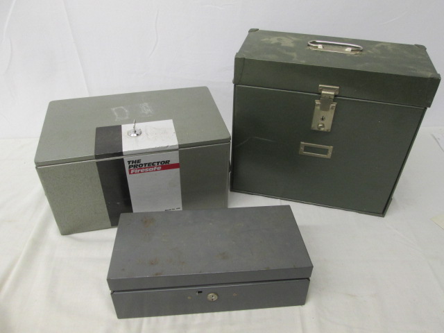 Three metal lock boxes, 2 with keys. In used, good condition. Please preview.