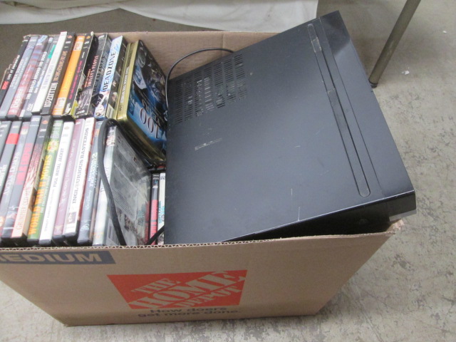 Large box of DVDs and an RCA DVD Home Theatre System RTD217 5 Disc Changer. In used, good condition. Please preview.