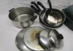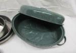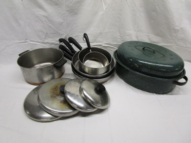 Just In time for the holidays! Collection of pots and pans (with lids) including two Revere Ware sauce pans, a Farberware fry pan, a green enamel roasting pan and more. These items are in used condition. Please preview.