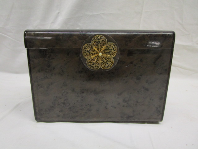 This gorgeous vintage 1950's brown marbled Wilardy, Bakelight box purse with a gold-toned filigree flower clasp measures 8-1/2"W X 4"D X 6"H. It is in used, good condition. Please preview.