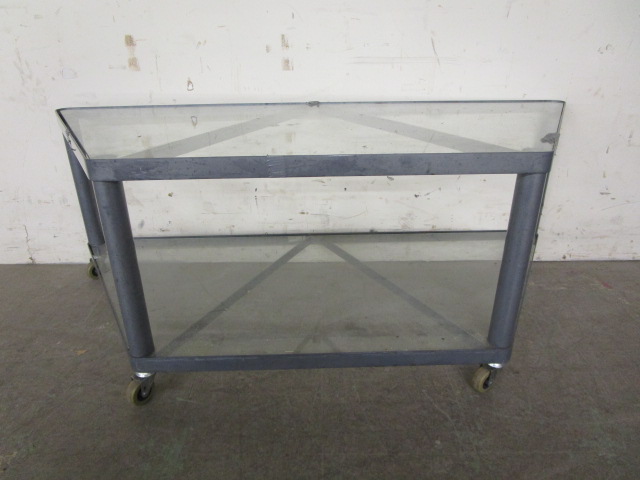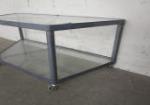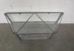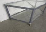 This unique, modern pentagon shaped glass and battle ship grey metal accent coffee table measures 44-1/2"W X 19" X 16-1/2"H. This item has casters for easy movement. It is in used, good condition with some minor scratches on the surface. Please preview.