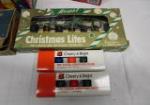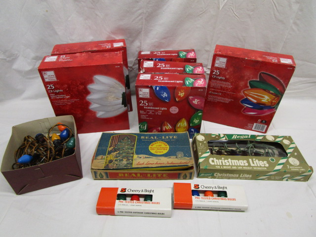 This large assortment of Christmas tree lights includes three packages of Home Accents brand 25 C9 indoor/outdoor lights, three boxes of Home Accent 25 count C7 multi-colored lights, a box of older Westinghouse bulbs, a Regal brand box of Christmas lights and more. These items are in new, and used, good condition. Please preview.