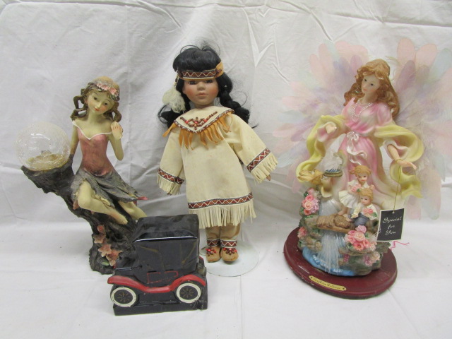 This miscellaneous collection of garden/home decor includes a 13" solar powered fairy light (missing her wings), a 15" fiberoptic Ray Chia Collection Angel figure (missing the on/off switch), a 15" Native American doll on a stand, and a 5-1/2" ceramic replica of a 1913 Chevrolet car (has several cracks). These items are in used, damaged condition. Please preview.