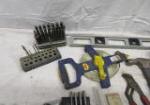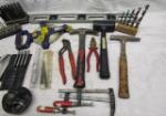 This large selection of hand tools includes a level, clamps, hammers, drill bits, an XW brand scraper and more. These items are in used, good condition. Please preview.