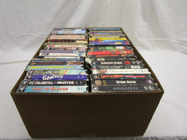 VHS Movie Tapes Box#6 titles include my cousin vinny, Jurassic park, on Golden pond, It's a Wonderful life, Abbott and Costello and others. 88 in all. Used, please preview.