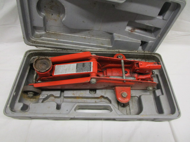 Unbranded Hydraulic Floor Jack with case (case is damaged). Jack is 20" long x 9" wide x 5.5" tall. Please preview.