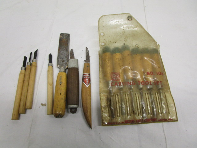 Small box lot of wood carving tools including a Millers Falls carving tool set #106. Please preview.