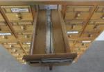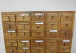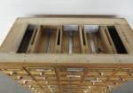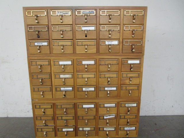 Three sections vintage library card catalogue cabinets each section measuring 33" wide x 18.5" deep x 13" tall. Please preview.