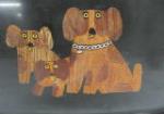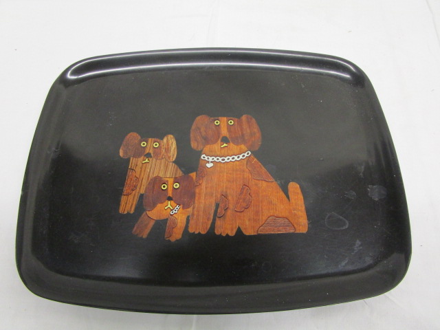 Midcentury stylized dogs wood inlay tray by Couvac of Monteray. Measures 12.5" wide x 9.5" deep x 1/2" tall. Please preview.