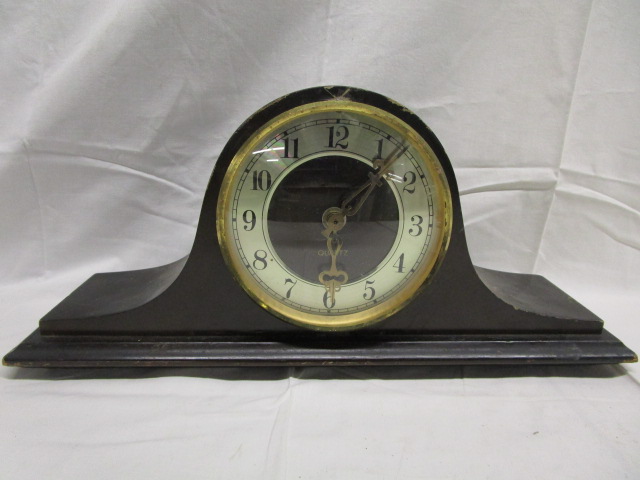 Vintage mantle clock that needs some love. Measures 17.5" wide x 8" tall x 4.5" deep. Please preview.