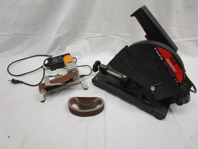 Drill Master 6 inch cut off saw with Mini 2 speed belt sander. Measures approximately 8 in. The sanding belts are approximately 5 in. Both in very good previously owned condition. The sander comes with extra belts. Please preview.