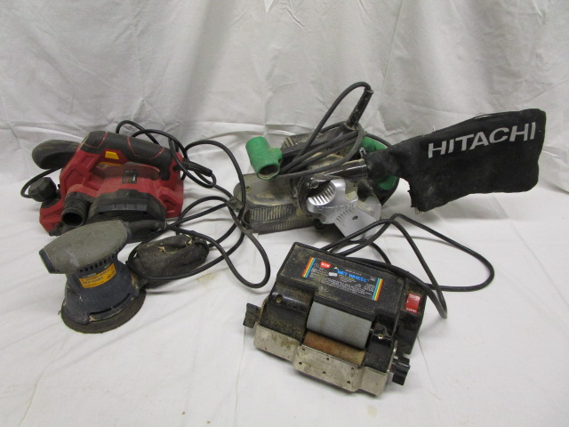 Wen Wet Wheel Machine, Chicago Electric three and a quarter inch electric planer, Hitachi sb8v2 3-in belt sander with bag and Chicago tools 5 inch random orbital palm sander. All tools have been plugged in and are in working condition. Please preview.