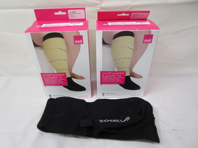 This pair of new Medi brand Circaid & Juxtalite inelastic compression system lower leg panels (model # CJL1S003) are beige and size large. Also included is a pair of (size medium - large) M-Circaid black compression socks. These items are in new and used, good condition. Please preview.