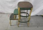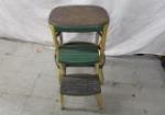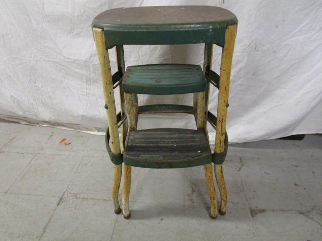 This vintage 24" Cosco brand metal step stool has three steps with a green finish and yellow trim. THis item does have some rust due to age. It is in used condition. Please preview.