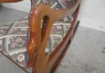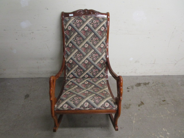 This gorgeous Statesville rocking chair features needle point upholstery on the seat and back. This chair also features armrests with carved swan heads and necks. This piece measures 22"W X 32"D X 36"H. It does have some minor surface scratches, but is in overall good condition. Please preview.