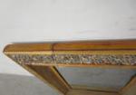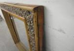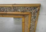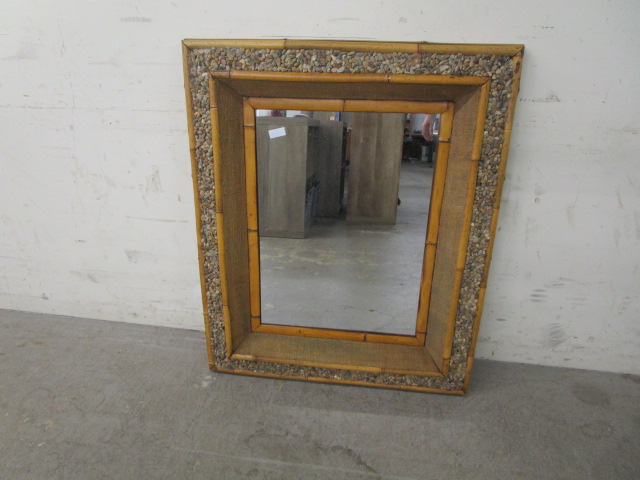 This beautiful 30" X 36" mirror with bamboo style frame is also adorned with river washed pebbles and burlap. This mirror is a must see. It does have a very thin hardly noticeable 7" scratch. It is in used, good condition. Please preview.