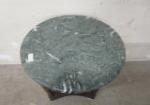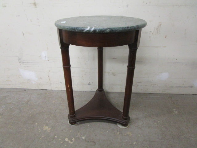 This vintage mid century Regency style side table features a green marble top. This piece measures 18"W X 25"H. This piece is in used, good condition. The top is detached from the base and there are some small surface scratches on the marble top. Please preview.
