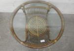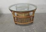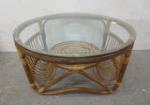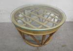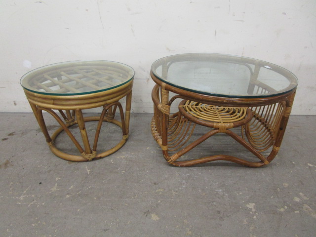 This pair of bamboo/rattan base, glass top side table /coffee tables (with decorative spiral second tier base feature removable tops for easy movement and cleaning. The round bamboo side table measures 19-1/2"W X 25"H and the round rattan coffee table measures 24" W X 15-1/2"H. These pieces are in used, good condition. Please preview.