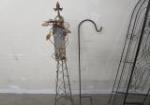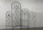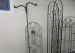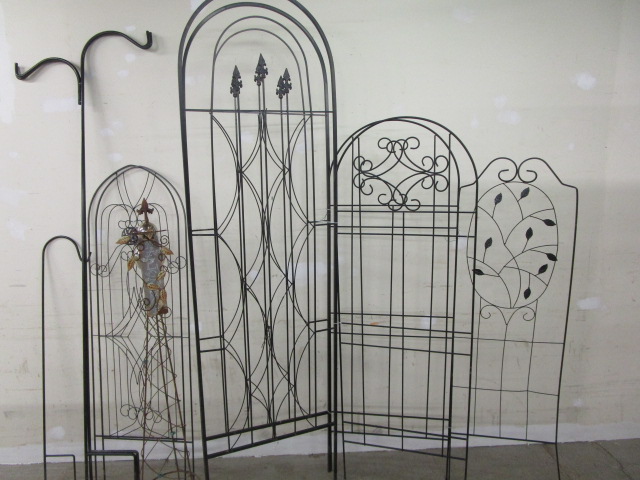 This assortment of garden/yard decor includes a 55" garden obelisk (climbing support pyramid), a 60" 2-piece trellis, and a single 59" trellis with a leaf motif, a pair of 82" metal trellises, a pair of 66" arched trellises, a pair of 83" double sided plant/bridge feeder "shepherd" hooks and a 46" single hook plant hanger. These items are in good condition. Please preview.