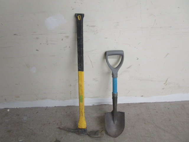 This pair of garden/yard tools includes an "Expert Gardener" brand pick ax and a Bloom Mini-D handled shovel. These items are in used, good condition. Please preview.