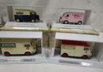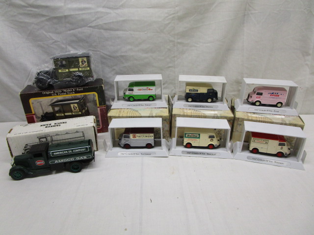 This nice collection of collectible model cars/trucks includes four models from the Matchbox "Taste of France" series including the YTF 1, 1947 Citroen Type H van "Evian", the YTF 2, 1947 Citroen Type H van "Martell", YTF 6, 1947 Citroen Type H van "Pommery", the YTF 4, 1947 Citroen Type H van "Marcillat", the Matchbox "Models of Yesteryear" including the YTF 5 1947 Citroen Type "H" van "Taittinger", and the TYF 2 1947 Citron Type H Van "Martell". Also included is a 1:25 scale 1929 die cast "Model A" Ford Postal truck and a Joseph L. Ertl die cast metal Tanker Truck bank. These items are in their original boxes and are in new condition. Please preview.