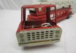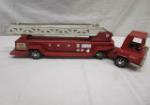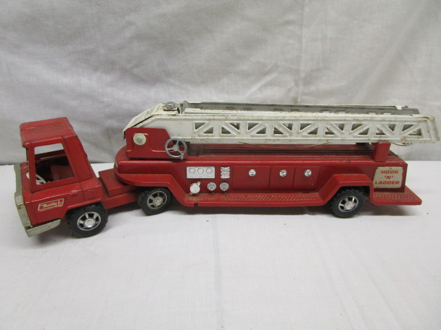 This collectible, vintage Buddy L pressed steel 16" aerial hook and ladder fire truck toy is in vintage, used, good condition. Please preview.