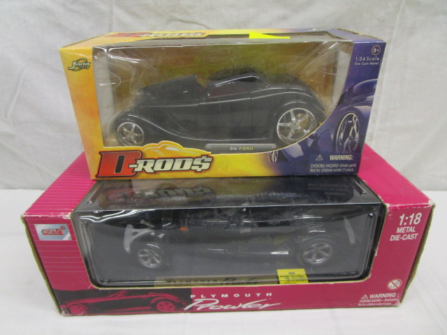 This nice new pair of collectible die cast metal model cars includes a Jada Toys D-Rods 1:24 scale '34 Ford and an Anson 1:18 scale Plymouth Power model car. These items are in new condition in their sealed boxes. Please preview.