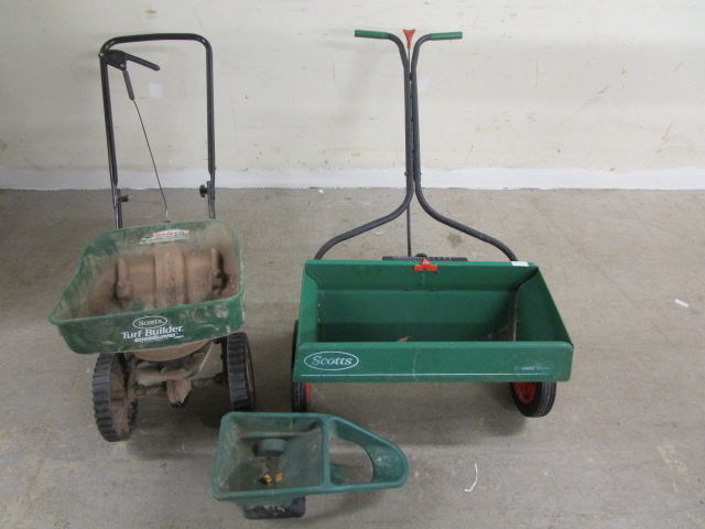 This trio of seed spreaders includes two Scotts brand seed spreaders and an "Expert Gardener" hand held spreader. These items are in used, good condition. Please preview.