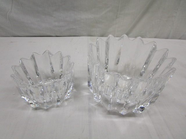 This fantastic pair of vintage Orrefors "Fleur" crystal bowls designed by Jan Johansson are examples of a Swedish crystal design featuring a scalloped edge and faceted sides (like a crown). Measurements include 4-1/2" and 6-1/2" These items are in used, good condition. Please preview.