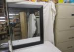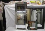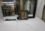 This trio of mirrors includes a 15" X 40" rectangular mirror with a beveled glass frame, 27" X 34" a rectangular beveled mirror with a dark wood frame (this item has some scratches and a chip in the frame) and a 12-1/2" X 12-1/2" small square mirror featuring a tile style frame. These mirrors are in used, good condition.