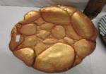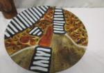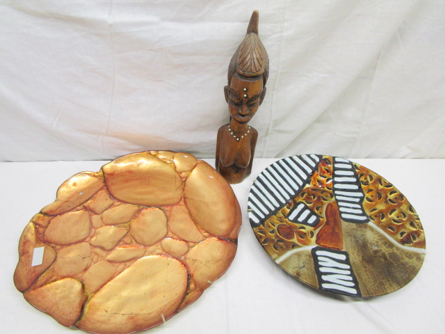 This trio of home decor items includes a 15" hand carved bust of an African woman, a 15" Kosta Boda style art glass plate and a 17-1/2" hand painted "Three Hands" decorative plate. These plates have attachments for display on a wall. These items are in used, good condition. Please preview.