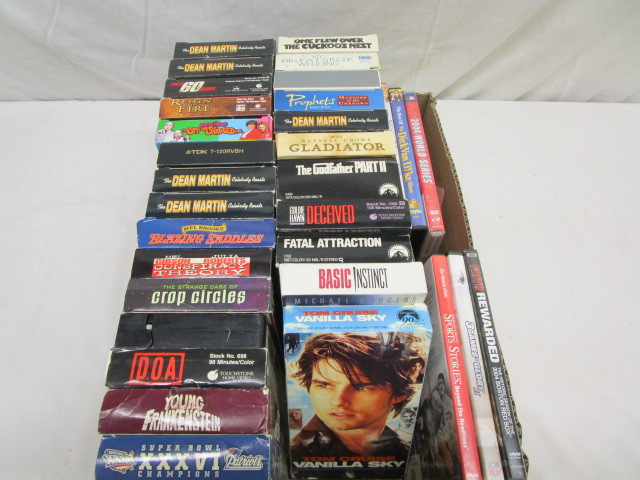 This assortment of over thirty VHS tapes and DVDs from a variety of genres and show casing a variety of stars. Titles include "Blazing Saddles", "DOA", "Vanilla Sky" and more. These items are in used, good condition. Please preview.