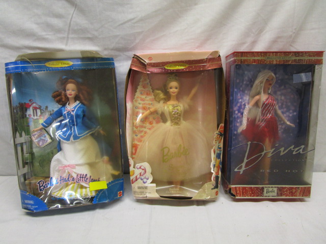 This trio of new collectible Barbies includes "Diva Red Hot Barbie", "Sugar Plumb Fairy Barbie" and "Barbie Had A Little Lamb Barbie". These items are in new condition, in their original boxes. The boxes have some damage due to storage. Please preview.