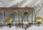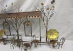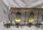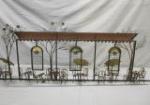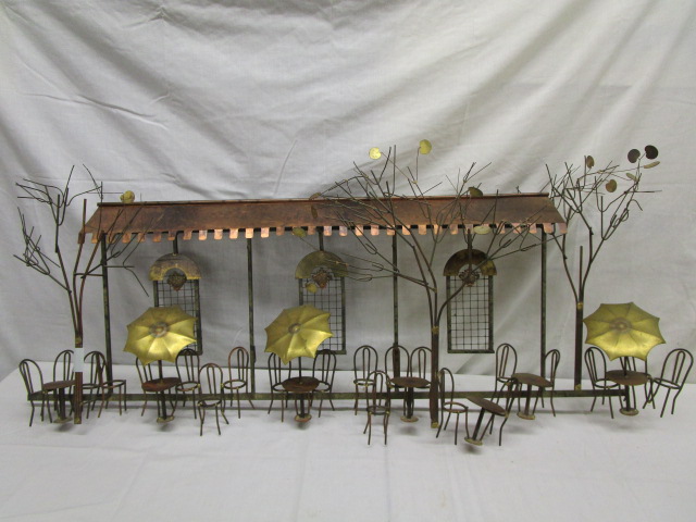 This interesting 44"W X 5"D X 16"H metal wall sculpture features an outdoor cafe scene with a cafe front, tables, chairs, umbrellas, and trees. This item is in used, good condition. Please preview.