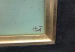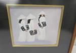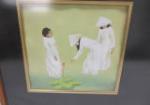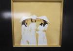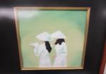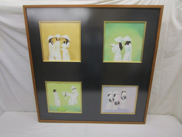 This large outer wooden frame holds four unique oil on board paintings similar to the style of "Vietnamese Women In White" by artist Nguyen Thanh Binh. This item is in very good condition. Please preview.