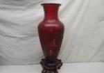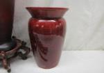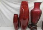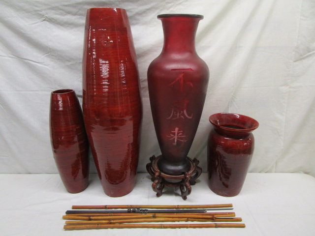 This collection of four Chinese sang de boeuf style vessels featuring three items (12", 16" and 27") from the "Sixtrees Lacquerware" collection. These pieces are very light. The fourth piece is a 22" heavy frosted glass piece with Chinese symbols on it and a stand. These pieces are in used, good condition. Please preview.