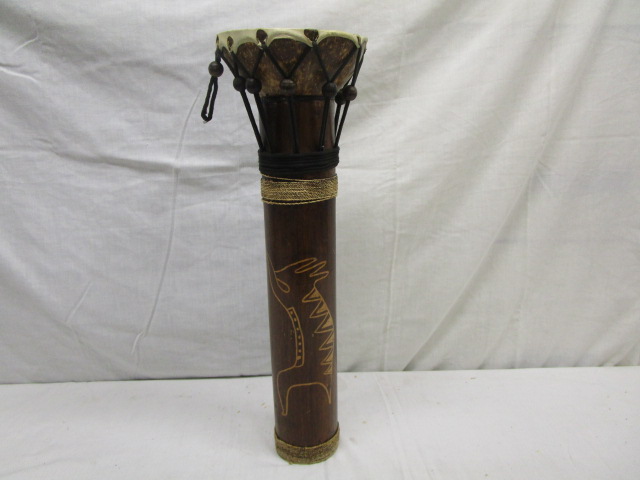 This unique 20" djembe, goblet shaped drum from West Africa does have a large crack in one side. It is in used condition. Please preview.