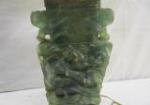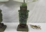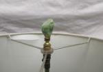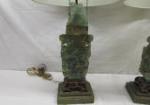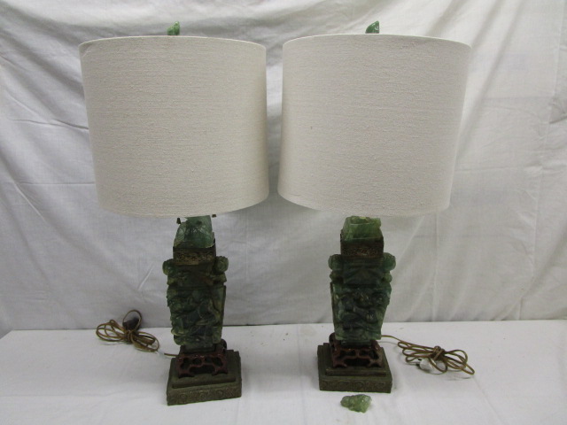This pair of 26" vintage Chinese carved green quartz table lamps feature carved birds and ornate carved bases. These lamps do have some chipping and one of the birds has chipped off (but is included for repair). These lamps are in used condition. Please preview.