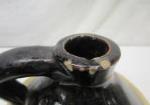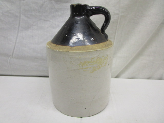 This vintage 11" two-tone stoneware jug has some chips on the base, a surface crack and small chips on the rim. Please preview.