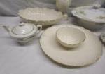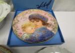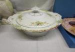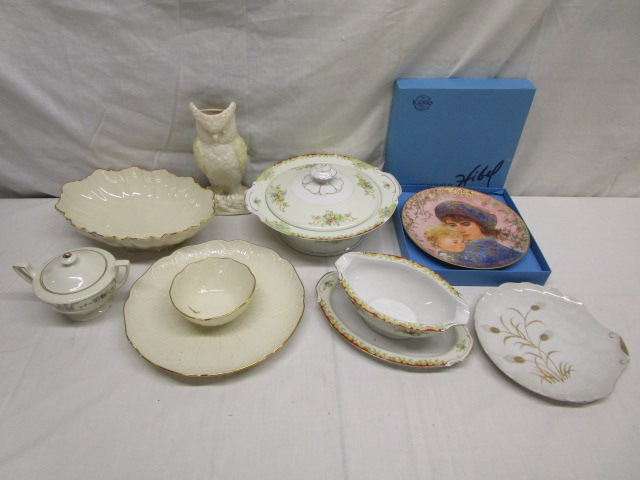 This selection of porcelain dishware includes a Lenox dip plate, a 10-1/2" Lenox fruit bowl, a collectible Knowles brand Hibel Mother's Day Plate (#9501F), an 8" Belleek owl vase, an Embassy China floral covered serving bowl and more. These pieces are in good condition with the exception of the covered serving bowl. This bowl has some chipping in the bowl itself. Please preview.