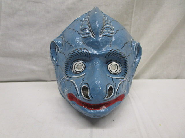 This whimsical 9" paper mache monkey mask is in hand-made, good condition. Please preview.